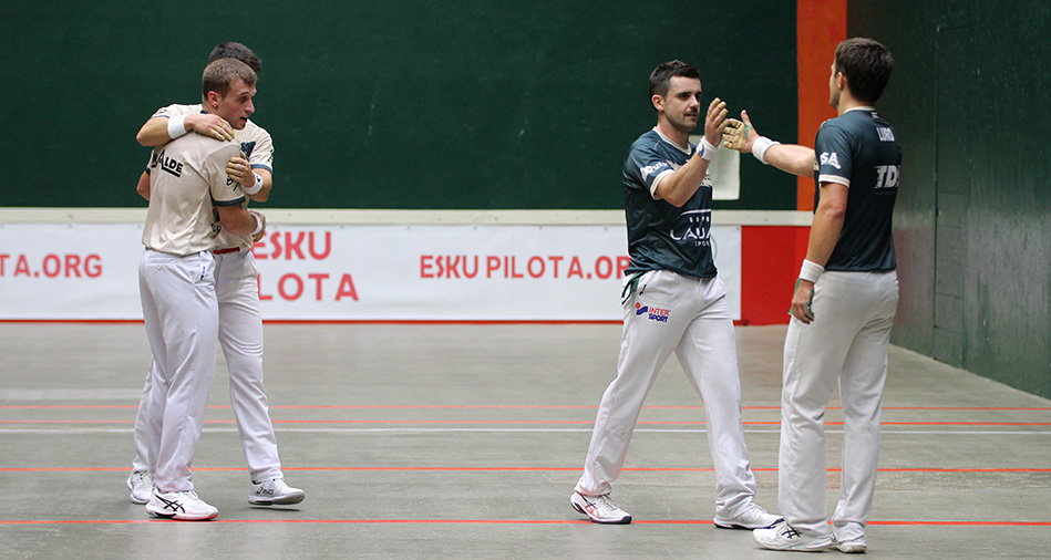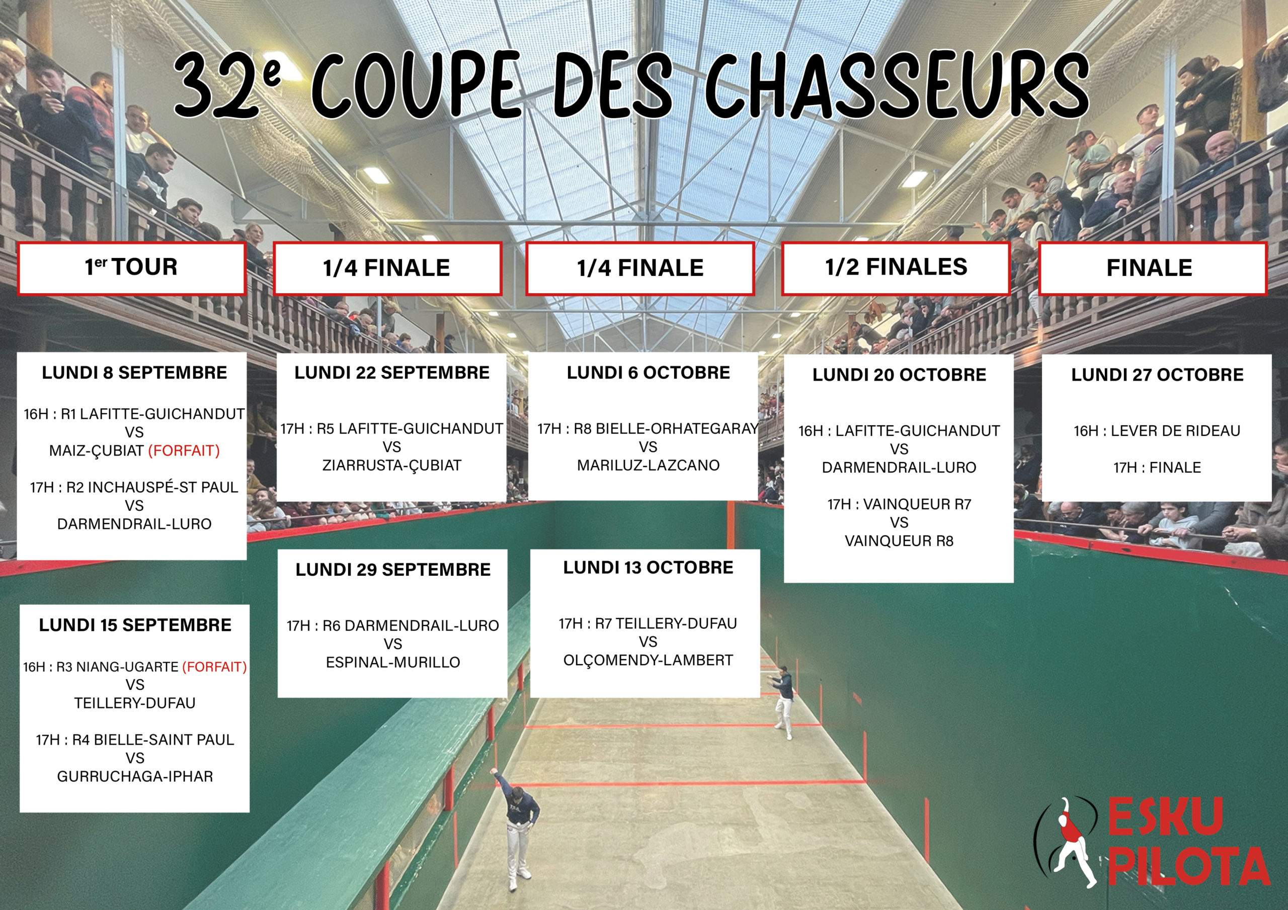 Les quarts de finale de la Coupe des chasseurs se poursuivent au trinquet Garat. Mickaël Darmendrail et Antton Luro ont dominé Iker Espinal et Arai Murillo, ce lundi 29 septembre. D’entrée de jeu, Darmendrail-Luro ont pris l’avantage (6-1 ; 15-7) en évitant un maximum Iker Espinal. Antton Luro a dominé son vis-à-vis qui a souvent été dépassé dans cette partie. Mickaël Darmendrail a également fait la différence au but (dix-huit au total), ce qui a permis à son équipe de mener les débats facilement et s’imposer 40-12 en moins d’une heure.