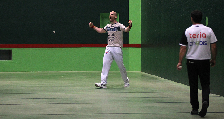 À seulement trois points de la victoire (37-34), Julen Mariluz a ressenti des crampes dans les deux jambes. Teillery-Ducassou ont profité de cette baisse physique pour revenir à 37 partout. Malgré la douleur, Julen Mariluz a terminé la partie au mental et Ximun Lambert a pris les choses en mains pour n’être plus qu’à un point de la victoire (39-37). Sur le point suivant, Ximun Lambert a redonné le but à ses adversaires en commettant une faute directe. La sanction fut immédiate. But gagnant d’Iban Teillery. 39 partout. Un dernier point surréaliste. Julen Mariluz au sol après avoir tapé une pelote. Ximun Lambert seul maître à bord face à Teillery-Ducassou tente une attaque au filet, qui rentre ! Victoire 40-39 au bout l’effort.
